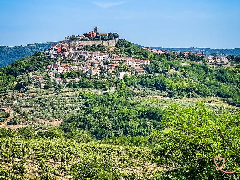 A aldeia de Motovun é uma das mais belas aldeias no topo de uma colina emÍstria, reconhecível pela sua silhueta com vista para os vales verdes, vinhas e florestas de trufas pelos quais a região é famosa. Ficámos impressionados com a sua atmosfera medieval perfeitamente preservada, com as suas muralhas, ruas empedradas e casas de pedra formando um conjunto harmonioso no topo da colina. A chegada à aldeia oferece um dos panoramas mais emblemáticos daÍstria Verde, uma paisagem montanhosa que combina culturas, florestas e uma luz suave.
